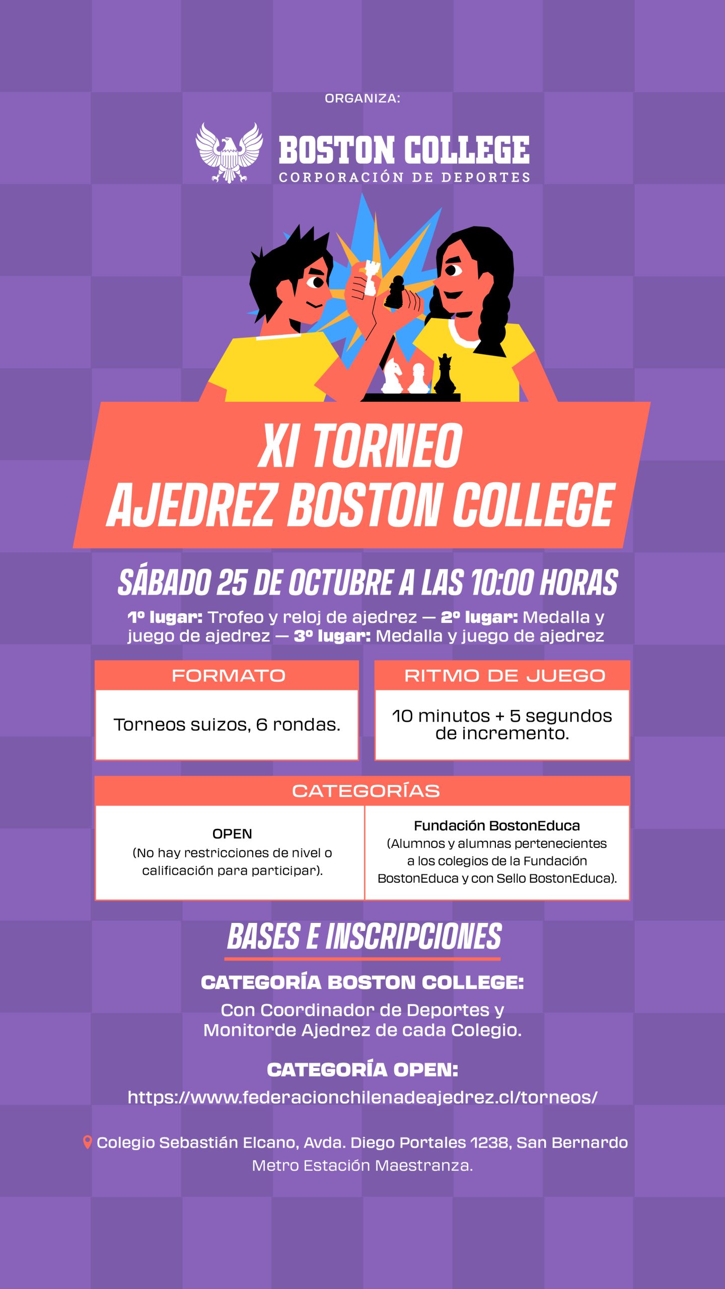 El certamen contará con las categorías Fundación BostonEduca y Open, con inscripción gratuita para la categoría Fundación, a través del Coordinador de Deportes o Monitor de Ajedrez de cada establecimiento.